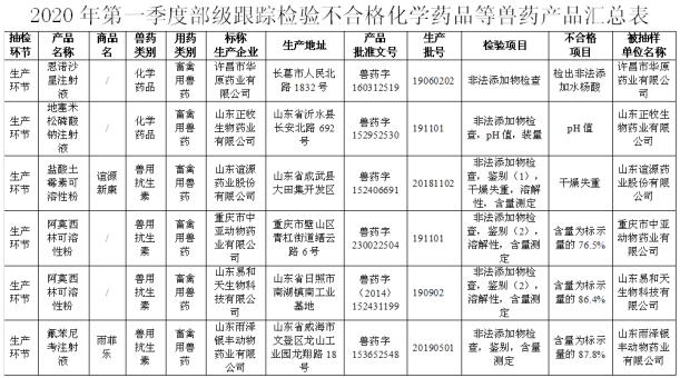 2. 2020年第一季度部級(jí)跟蹤檢驗(yàn)不合格化學(xué)藥品等獸藥產(chǎn)品匯總表