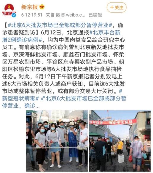 不僅如此,目前北京新發(fā)地批發(fā)市場、順鑫石門批發(fā)市場、懷柔萬星農(nóng)副市場、朝陽松榆東里市場,京深海鮮批發(fā)市場,6個大型批發(fā)市場整體或者部分暫停營業(yè)。