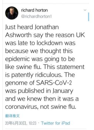 當(dāng)?shù)貢r(shí)間6月30日,世界醫(yī)學(xué)權(quán)威雜志《柳葉刀》主編理查德·霍頓在其社交網(wǎng)站中駁斥英國(guó)影子衛(wèi)生大臣喬納森·阿什沃斯關(guān)于“英國(guó)疫情防控不及時(shí)是因?yàn)榇饲罢`以為病毒類(lèi)似豬流感”的言辭。