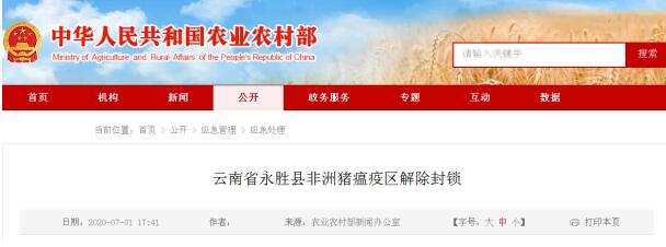 永勝縣非洲豬瘟疫情發(fā)生后,當?shù)匕凑辗侵挢i瘟疫情應(yīng)急預(yù)案和非洲豬瘟防治技術(shù)規(guī)范要求,采取了封鎖、撲殺、消毒、無害化處理等措施。疫區(qū)內(nèi)應(yīng)撲殺生豬撲殺完成后,經(jīng)21天以上連續(xù)監(jiān)測排查,疫區(qū)內(nèi)未發(fā)現(xiàn)新的病例和監(jiān)測陽性。麗江市農(nóng)業(yè)農(nóng)村局組織專家對永勝縣疫區(qū)進行現(xiàn)場評估驗收,驗收結(jié)果符合關(guān)于疫區(qū)解除封鎖的有關(guān)規(guī)定,當?shù)卣綄σ邊^(qū)解除封鎖。農(nóng)業(yè)農(nóng)村部要求當?shù)匦竽莲F醫(yī)部門繼續(xù)加強疫情監(jiān)測排查,采取積極的防控措施,防止非洲豬瘟疫情再次發(fā)生。