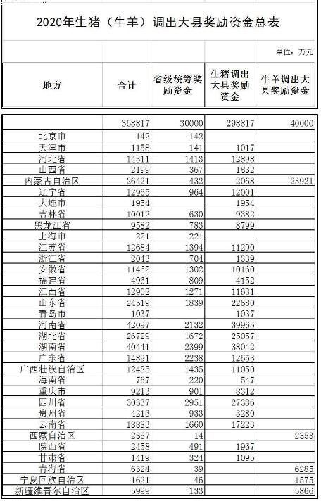 附件:1.2020年生豬(牛羊)調出大縣獎勵資金總表(不發(fā)地方)