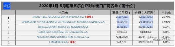 據(jù)海關(guān)數(shù)據(jù)顯示:2020年1-5月,厄瓜多爾對(duì)華出口廠商中,桑塔排名第一。1-5月厄瓜多爾白蝦到港總量為15.49萬噸,到港總金額為60億元。其中,桑塔占總比22.74%,藍(lán)泰占比4.16%。