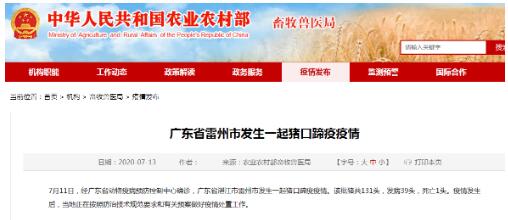農(nóng)業(yè)農(nóng)村部畜牧獸醫(yī)局網(wǎng)站消息,7月11日,經(jīng)廣東省動(dòng)物疫病預(yù)防控制中心確診,廣東省湛江市雷州市發(fā)生一起豬口蹄疫疫情。該批豬共131頭,發(fā)病39頭,死亡1頭。疫情發(fā)生后,當(dāng)?shù)卣诎凑辗乐渭夹g(shù)規(guī)范要求和有關(guān)預(yù)案做好疫情處置工作。