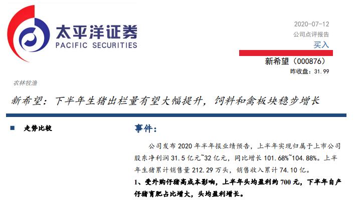 事件:公司發(fā)布2020年半年報(bào)業(yè)績(jī)預(yù)告,上半年實(shí)現(xiàn)歸屬于上市公司股東凈利潤(rùn)31.5億元~32億元,同比增長(zhǎng)101.68%~104.88%。上半年生豬累計(jì)銷售量212.29萬(wàn)頭,銷售收入累計(jì)74.10億。