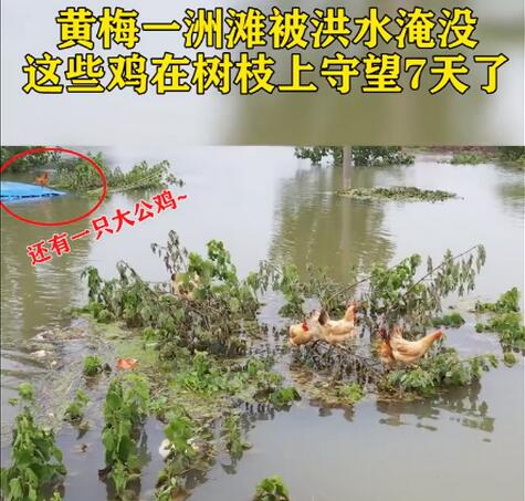 7月13日,黃梅縣新開(kāi)鎮(zhèn)蔡家渡村,一群雞被洪水圍困,在樹(shù)枝上站著。當(dāng)?shù)胤姥粗笓]部介紹,團(tuán)洲圩外圍的子堤于7月8日潰口,團(tuán)洲圩外圍的洲灘全部淹沒(méi),居民安全轉(zhuǎn)移,部分家禽來(lái)不及轉(zhuǎn)移,被困洪水中。截至今天,這些雞在樹(shù)枝上守望了7天。