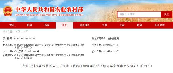 為進一步做好獸藥注冊工作,我局組織修訂了《獸藥注冊辦法》,現(xiàn)形成《獸藥注冊管理辦法(修訂草案征求意見稿)》(附后)。請各有關(guān)單位認真研究,提出修改意見,并于2020年7月31日前將書面意見發(fā)送至電子郵箱:syjyzyxc@agri.gov.cn。