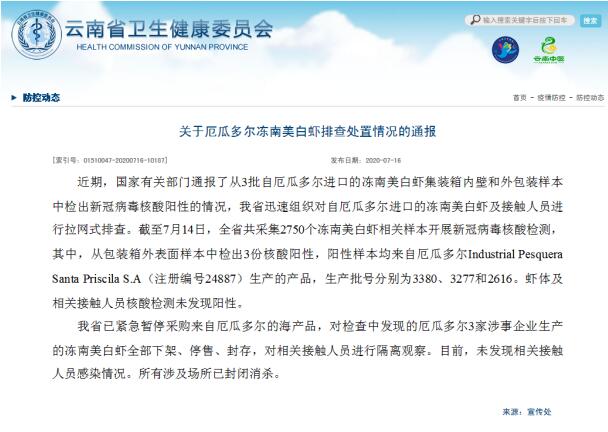 云南省已緊急暫停采購(gòu)來(lái)自厄瓜多爾的海產(chǎn)品,對(duì)檢查中發(fā)現(xiàn)的厄瓜多爾3家涉事企業(yè)生產(chǎn)的凍南美白蝦全部下架、停售、封存,對(duì)相關(guān)接觸人員進(jìn)行隔離觀察。目前,未發(fā)現(xiàn)相關(guān)接觸人員感染情況。所有涉及場(chǎng)所已封閉消殺。