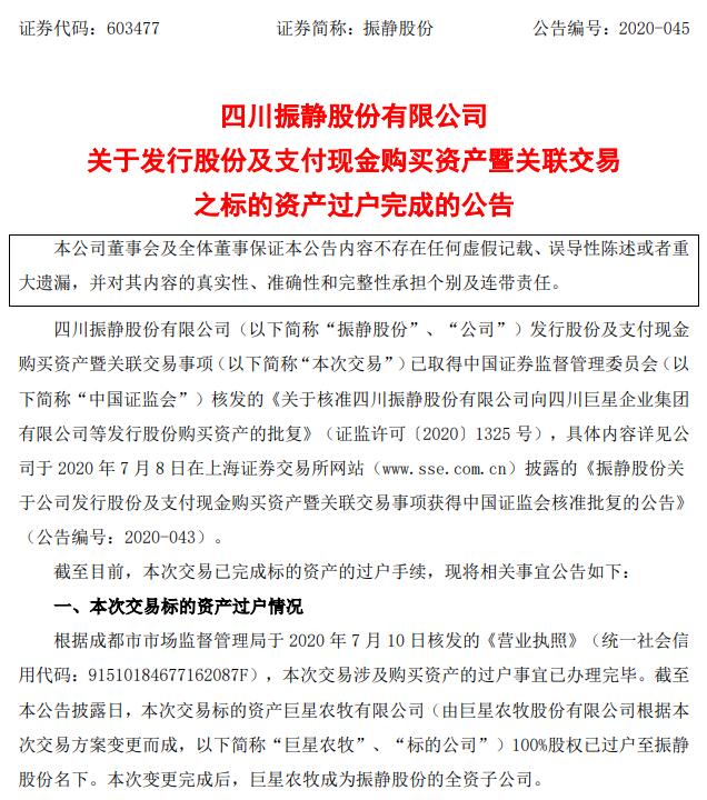 本次變更完成后,巨星農(nóng)牧成為振靜股份的全資子公司。