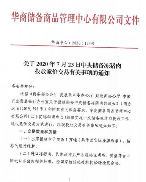 華儲網(wǎng)7月21日發(fā)布中央儲備凍豬肉投放競價交易有關事項的通知,將競價交易1萬噸,交易時間為2020年7月23日下午13時至16時,這是今年以來第25批投放的中央儲備凍豬肉,累計投放量將達45萬噸。