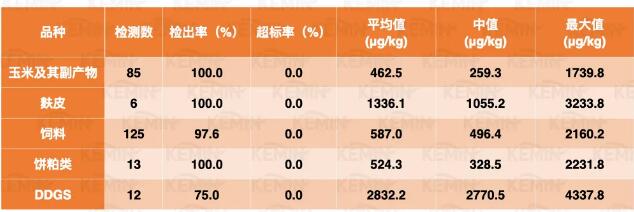 表1. 2019年飼料及原料嘔吐毒素污染檢測結(jié)果