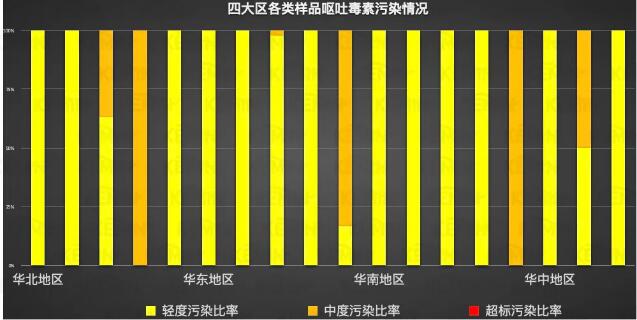 表1結(jié)果顯示,飼料及各類原料中嘔吐毒素均未出現(xiàn)超標污染,但從均值和中值來看,DDGS類原料中值偏高,須引起重視。根據(jù)圖1區(qū)域分析結(jié)果,華東和華南地區(qū)嘔吐毒素以DDGS中度污染為主,均值分別為3126.2 μg/kg、2770.5 μg/kg。華中地區(qū)50% 左右的麩皮嘔吐毒素為中度污染(缺乏該地區(qū)餅粕類以及DDGS類樣品)。華北地區(qū)嘔吐毒素以餅粕類原料中度污染為主,均值為343.8 μg/kg,DDGS、麩皮和玉米及其副產(chǎn)物等為輕度污染,同時該地區(qū)飼料中亦檢出大于30% 的中度污染,該地區(qū)應注意餅粕類原料中嘔吐毒素帶來的風險。