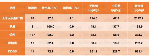 表2. 2019年飼料及原料玉米赤霉烯酮污染檢測結(jié)果