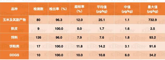 參考我國《飼料衛(wèi)生標準》(GB13078-2017)制定的毒素限量標準,我們將毒素含量低于一半限量標準的樣品判定為輕度污染,高于一半限量標準但低于限量標準的樣品判定為中度污染,高于限量標準的樣品定為重度污染,即超標污染(以下判定類同)。