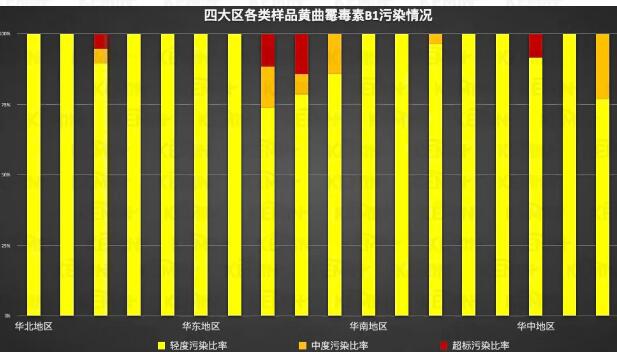 從圖3可以看出,四大區(qū)均出現(xiàn)黃曲霉毒素B1中度或以上污染。華東地區(qū)的飼料樣品中黃曲霉毒素B1中度及以上污染比例最高,達到26.3%,該地區(qū)餅粕類和DDGS原料黃曲霉毒素B1中度污染及以上污染比率分別為21.4% 和14.3%,推測是該區(qū)域飼料中黃曲霉毒素B1污染與這兩種原料有一定關(guān)聯(lián);華中地區(qū)玉米及其副產(chǎn)物超標污染率達到8.3%,可能是導致該區(qū)飼料黃曲霉毒素B1出現(xiàn)較高比例(23.1%)的中度污染的原因之一。華北地區(qū)飼料黃曲霉毒素B1超標污染率和中度污染率均為5.3%;華南地區(qū)各類樣品整體黃曲霉毒素B1污染程度較低。