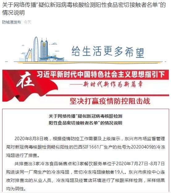 據(jù)防城港發(fā)布微信號(hào)9日消息,2020年8月8日晚,根據(jù)疫情防控工作需要及上級(jí)指示,東興市市場(chǎng)監(jiān)督管理局對(duì)新冠病毒核酸檢測(cè)疑似陽(yáng)性的巴西SIF1661廠生產(chǎn)的批號(hào)為20200409的冷凍雞翅進(jìn)行了排查。