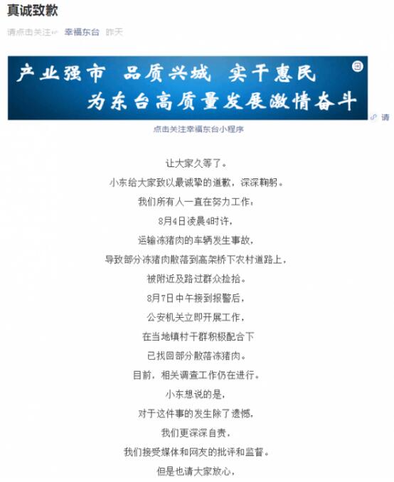 8月10日,東臺市公安局通報此事稱,公安機(jī)關(guān)接到報警后,開展調(diào)查處理工作,已追回部分散落豬肉?!皩ι嫦舆`法人員,公安機(jī)關(guān)將依法嚴(yán)肅處理,目前,相關(guān)調(diào)查工作正在進(jìn)行”。