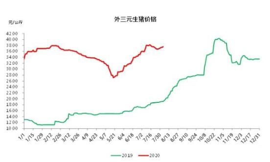 截止8月初,生豬市場表現(xiàn)堅(jiān)挺。其中外三元全國均價(jià)超過37.5元/公斤,環(huán)比上月同期上漲17.6%,同比上漲近一倍。南方銷區(qū)如廣東、浙江、福建等多地生豬價(jià)格已經(jīng)突破40元/公斤,湖南、湖北、安徽、廣西等產(chǎn)區(qū)價(jià)格也在38元/公斤以上。