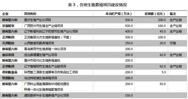 今年以來,各地在建和新建的生豬養(yǎng)殖項(xiàng)目概況如下表3,根據(jù)表中信息所示,分布在全國各地的57個(gè)生豬養(yǎng)殖項(xiàng)目總投資額近1000億元,按計(jì)劃這些項(xiàng)目在今年底以前或2021年內(nèi)就將全部或部分投產(chǎn),合計(jì)可提供至少4500萬頭生豬新增出欄量。而這還僅僅是全國新建養(yǎng)殖項(xiàng)目產(chǎn)能的一部分。