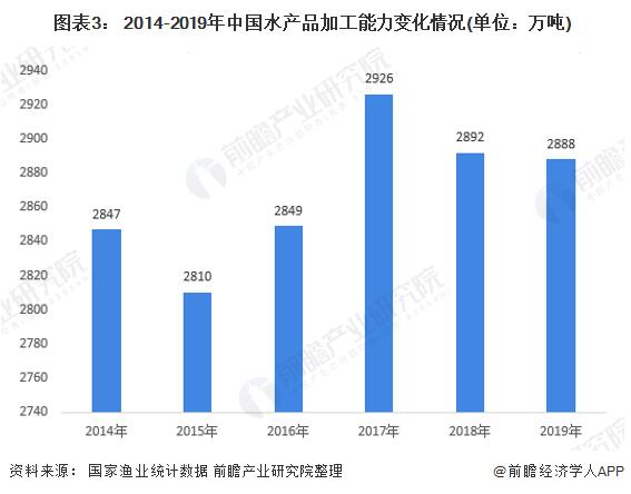 2014-2019年,我國(guó)水產(chǎn)品加工企業(yè)數(shù)量波動(dòng)下降,自2014年9663家降至9323家;水產(chǎn)品加工能力也呈現(xiàn)波動(dòng)變化的態(tài)勢(shì)。2017年,我國(guó)水產(chǎn)品加工能力達(dá)到峰值,實(shí)現(xiàn)2926萬(wàn)噸,隨著水產(chǎn)品加工企業(yè)數(shù)量的減少,2019年我國(guó)水產(chǎn)品加工能力降至2888萬(wàn)噸。