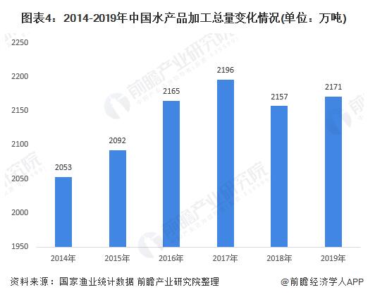 我國(guó)水產(chǎn)品加工總量整體上呈現(xiàn)波動(dòng)態(tài)勢(shì)。2014-2017年,我國(guó)水產(chǎn)品加工總量逐年增長(zhǎng),至2017年實(shí)現(xiàn)2196萬(wàn)噸。2018年,我國(guó)水產(chǎn)品加工總量下滑,至2019年又提升至2171萬(wàn)噸。整體變化幅度較小且較為穩(wěn)定。預(yù)計(jì)未來(lái)我國(guó)水產(chǎn)品加工總量仍將小幅震蕩上升。