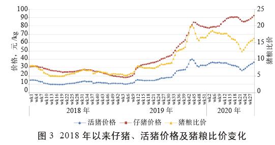 如圖3所示,2020年以來(lái),河南省豬糧比價(jià)從1月22日的最高峰18.6:1逐步下降到5月20日的最低谷12.4:1;5月下旬以來(lái),活豬價(jià)格持續(xù)上漲,7月8日豬糧比價(jià)回升到16.29:1,出欄1頭育肥豬可盈利2500元左右。