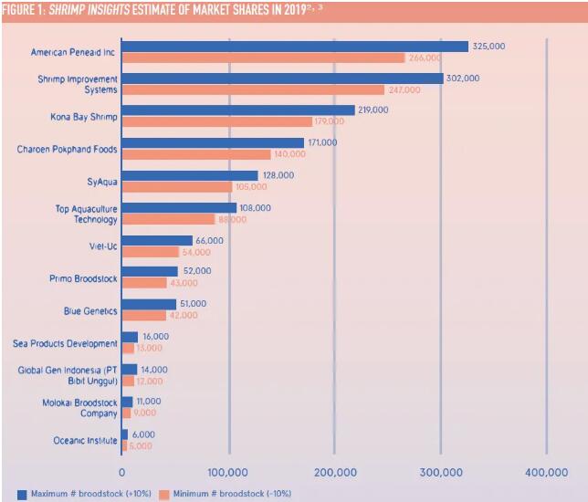 2019年,全球前五大種蝦生產(chǎn)商分別為American Penaeid Inc. (API)、 Shrimp Improvement Systems (SIS)、 Kona Bay Shrimp (Kona Bay)、 CP Foods (CPF) 和SyAqua,五家企業(yè)占據(jù)全球75%市場份額(加上Top Aquaculture Technology公司,市場份額或達(dá)85%)。