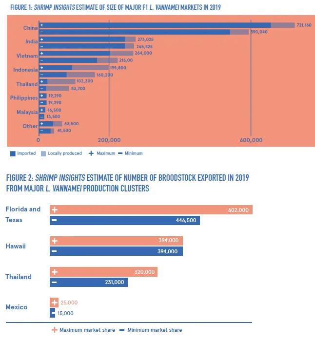 報告指出,2019年全球SPF南美白蝦種蝦市場容量在140-170萬尾(各國市場需求量如下),每尾平均售價55美元,總產(chǎn)值在7,700萬美元至9,500萬美元之間。SPF種蝦市場集中在亞洲,大市場有中國、印度、印尼、泰國和越南,小市場如馬來西亞、菲律賓、韓國、斯里蘭卡和臺灣。南美洲國家,如厄瓜多爾,擁有本地種蝦生產(chǎn)系統(tǒng),不依賴進(jìn)口,生物安全性較弱。巴西、墨西哥、危地馬拉等新興養(yǎng)殖國有望成為未來進(jìn)口種蝦市場。