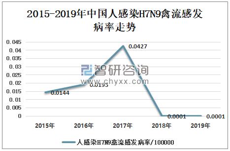 2017年中國人感染H7N9禽流感發(fā)病率0.0427/10萬;2018年中國人感染H7N9禽流感發(fā)病率0.0001/10萬;2019年中國人感染H7N9禽流感發(fā)病率0.0001/10萬。