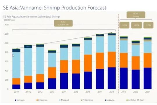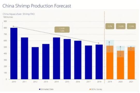 據(jù)GAA的受訪者稱,2019年全球蝦產(chǎn)量增長了1.5%,或多或少恰好達(dá)到400萬噸,隨后又下降了10.5%,至剛好350萬噸多一點(diǎn)。然后,2021年將有8.4%的恢復(fù),再次接近4百萬。