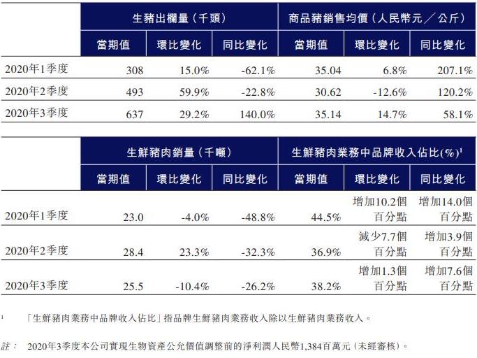 2020年第三季度生豬鮮肉銷量2.55萬(wàn)噸,同比減少26.2%,生鮮豬肉業(yè)務(wù)中品牌收入占比38.2%,同比增加7.6個(gè)百分點(diǎn)。