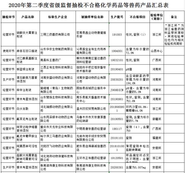 2020年第二季度完成化學(xué)藥品等獸藥產(chǎn)品省級(jí)監(jiān)督抽檢2381批,不合格37批(見附件1)。
