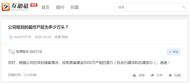 牧原股份:目前具備建設(shè)8000萬產(chǎn)能的潛力