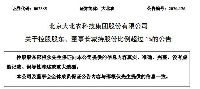 大北農(nóng)10月29日晚間發(fā)布公告稱,北京大北農(nóng)科技集團股份有限公司于2020年10月28日收到控股股東、董事長邵根伙先生《關(guān)于減持北京大北農(nóng)科技集團股份有限公司股份超過1%的告知函》,邵根伙先生自2020年7月15日至本公告披露日,以集中競價、大宗交易方式減持本公司股份約5802萬股,占公司總股本的1.38%。