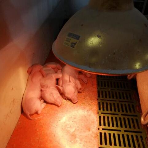 圖:2周大的仔豬在暖燈下