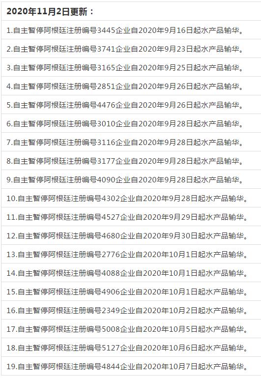 阿根廷19家企業(yè)自主暫停生產(chǎn)的水產(chǎn)品輸華。阿根廷新冠疫情依然嚴(yán)重,水產(chǎn)品企業(yè)相繼暴發(fā)疫情,提醒進(jìn)口商注意相關(guān)變化。