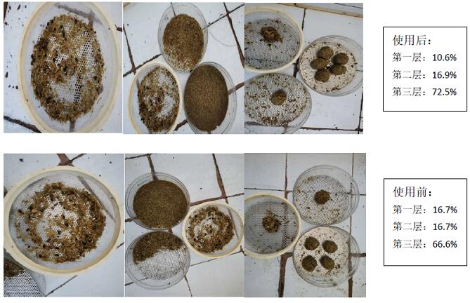 微生物中主要是乳酸菌、酵母菌、芽孢桿菌一類有益菌,可對瘤胃內(nèi)環(huán)境起到調(diào)節(jié)和保護的作用,持續(xù)保護瘤胃內(nèi)相對穩(wěn)定的微生物環(huán)境,有助于奶牛消化和提高食欲。消化酶中主要是木聚糖酶、纖維素酶、堿性蛋白酶,這一類酶的作用體現(xiàn)在腸道的消化能力提升,酶作用消化道必不可缺的一種物質(zhì),穩(wěn)定腸道環(huán)境,更有助消化功能提升,通過糞便分離篩可以更直觀看出飼喂發(fā)酵飼料后,消化能力有明顯的提升。