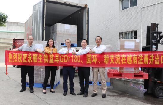 永順生物在越南注冊成功的高致病性豬繁殖與呼吸綜合征活疫苗(GDr180株)(以下簡稱“藍耳GDr180”)、豬圓環(huán)病毒2型滅活疫苗(WH株)(以下簡稱“圓環(huán)”)、雞新城疫、傳染性支氣管炎、禽流感(H9亞型)三聯(lián)滅活疫苗(La Sota株+M41株+HP株)(以下簡稱“新支流三聯(lián)”)三個產(chǎn)品正式出口,其中新支流三聯(lián)產(chǎn)品注冊批文是越南第一個有關禽流感(H9亞型)的進口批文。公司領導參加了出口產(chǎn)品裝柜儀式,熱烈祝賀藍耳GDr180、圓環(huán)、新支流三聯(lián)產(chǎn)品注冊成功并出口。