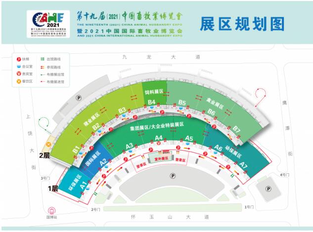 二、本屆畜博會(huì)展館分為兩層。一層為環(huán)保展館(A1館)、國際展館(A2館)、集團(tuán)展館(A3~A5館)與動(dòng)保展館(A6~A7館);二層為豬業(yè)展館(B1~B3館)、飼料展館(B4館)與禽業(yè)展館(B5~B7館)。