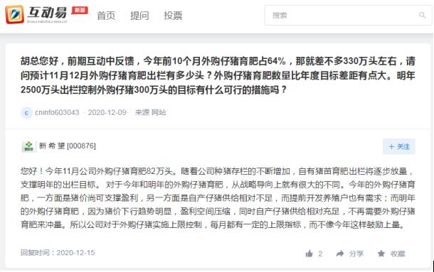 今年的外購仔豬育肥,一方面是豬價尚可支撐盈利,另一方面是自產(chǎn)仔豬供給相對不足,而提前開發(fā)養(yǎng)殖戶也有需求;而明年的外購仔豬育肥,因為豬價下行趨勢明顯,盈利空間壓縮,同時自產(chǎn)仔豬供給相對充足,不再需要外購仔豬育肥來沖量。所以公司對于外購仔豬實施上限控制,每月都有一定的上限指標(biāo),而不像今年這樣鼓勵上量。