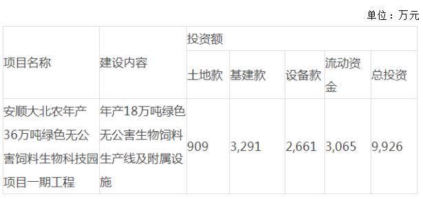 在非洲豬瘟疫情的持續(xù)影響下,公司為了響應(yīng)國(guó)家號(hào)召,搶抓養(yǎng)豬產(chǎn)業(yè)發(fā)展機(jī)遇,助力百姓菜籃子工程,協(xié)力地方穩(wěn)產(chǎn)保供,同時(shí)為了加快在西南地區(qū)的發(fā)展步伐,完善公司產(chǎn)業(yè)發(fā)展布局,擬設(shè)立全資子公司安順大北農(nóng)農(nóng)業(yè)科技有限公司(以下簡(jiǎn)稱“安順大北農(nóng)”),在貴州省安順市西秀區(qū)購(gòu)買土地50畝,用于建設(shè)年產(chǎn)36萬噸綠色無公害飼料生物科技園。該項(xiàng)目的總投資額為20,000萬元,其中項(xiàng)目一期建設(shè)18萬噸豬飼料生產(chǎn)線及附屬設(shè)施,投資額為9,926萬元。