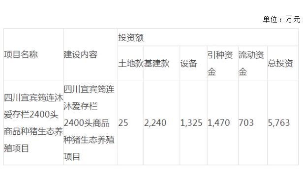 現(xiàn)計(jì)劃推進(jìn)宜賓市筠連縣50萬頭生豬生態(tài)養(yǎng)殖項(xiàng)目二期項(xiàng)目,擬建設(shè)第二個(gè)2400頭種豬場(chǎng),該項(xiàng)目滿負(fù)荷生產(chǎn)后可實(shí)現(xiàn)年出欄生豬6萬頭。該項(xiàng)目擬投資總額為5763萬元,由四川馳陽(yáng)全資子公司宜賓金馳陽(yáng)作為實(shí)施主體,資金來源于宜賓金馳陽(yáng)自有資金及銀行貸款。