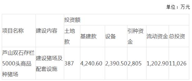 現(xiàn)雅安市蘆山縣30萬頭生豬生態(tài)養(yǎng)殖項(xiàng)目二期項(xiàng)目,擬建設(shè)第二個(gè)5000頭種豬場(chǎng),該項(xiàng)目滿負(fù)荷生產(chǎn)后可實(shí)現(xiàn)年出欄生豬12.5萬頭。項(xiàng)目投資總額為11,026萬元。該項(xiàng)目由四川馳陽(yáng)全資子公司蘆山金馳陽(yáng)農(nóng)牧有限公司(以下簡(jiǎn)稱“蘆山金馳陽(yáng)”)作為實(shí)施主體,資金來源于蘆山金馳陽(yáng)自有資金及銀行貸款。
