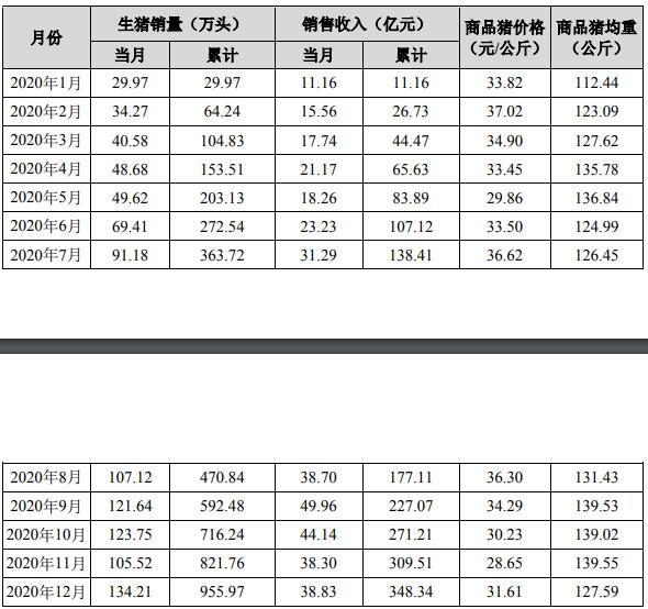2020年1-12月,公司累計銷售生豬955.97萬頭,同比上升65.28%;累計銷售收入348.34億元,同比增長206.04%。