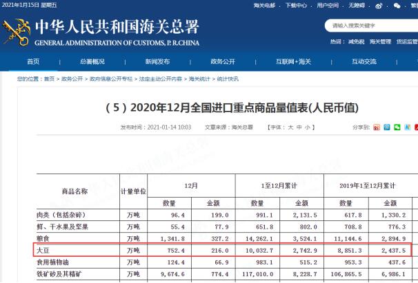 2020年全年累計(jì)進(jìn)口大豆10032.82萬噸,同比增幅11.7%,首次超過1億噸。