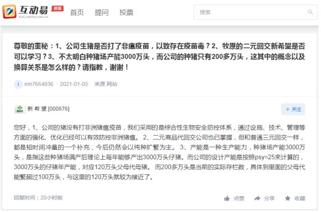 1、公司的豬沒有打非洲豬瘟疫苗,我們采用的是綜合性生物安全防控體系,通過設(shè)施、技術(shù)、管理等方面的強(qiáng)化、優(yōu)化已經(jīng)可以有效防控非洲豬瘟。