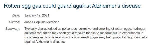 而其研究表明,大腦中的硫化作用會隨著年齡的增長而減緩,這一趨勢在阿爾茨海默氏癥患者中被放大。約翰斯·霍普金斯大學(xué)醫(yī)學(xué)院的研究團隊利用基因改造的模仿人類阿爾茨海默氏癥的小白鼠,給它們注射一種名為NaGYY的硫化氫化合物,這種化合物會在體內(nèi)釋放硫化氫分子。對小白鼠的行為測試表明,與未接受NaGYY注射的小鼠相比,硫化氫極大的改善了實驗組小白鼠的認知和運動功能,而且實驗組的小白鼠更加活躍。