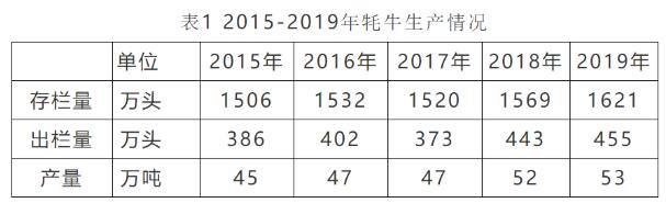 2015年以來,全國牦牛存欄量總體呈上升趨勢,從2015年的1506萬頭逐步增加到2019年的1621萬頭,年均增長1.5%;牦牛肉產(chǎn)量也由2015年的45萬噸增加到2019年的53萬噸,年均增長3.6%。
