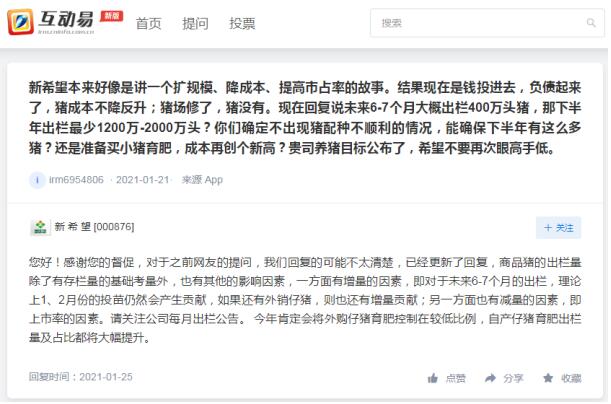 新希望1月25日在回復(fù)投資者互動時表示,商品豬的出欄量除了有存欄量的基礎(chǔ)考量外,也有其他的影響因素,一方面有增量的因素,即對于未來6-7個月的出欄,理論上1、2月份的投苗仍然會產(chǎn)生貢獻(xiàn),如果還有外銷仔豬,則也還有增量貢獻(xiàn);另一方面也有減量的因素,即上市率的因素。請關(guān)注公司每月出欄公告。