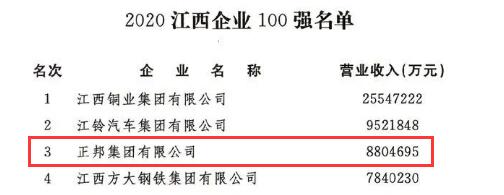 1月25日,江西省企業(yè)聯(lián)合會、省企業(yè)家協(xié)會發(fā)布2020江西企業(yè)100強榜單,正邦集團(tuán)以880億元營業(yè)收入位居第三。