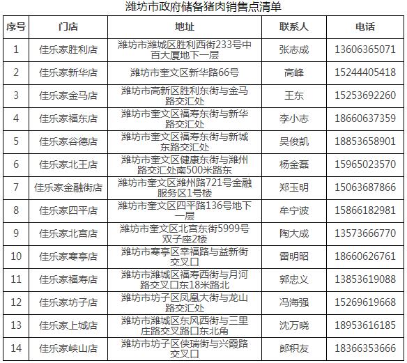據(jù)市發(fā)改委副縣級(jí)干部、三級(jí)調(diào)研員孫守良同志介紹:投放工作由市發(fā)改委會(huì)同商務(wù)、財(cái)政、農(nóng)業(yè)農(nóng)村部門共同組織實(shí)施。投放區(qū)域?yàn)闉H坊市區(qū)。投放的肉品規(guī)格是2號(hào)(前腿肉)、4號(hào)(后腿肉)凍豬肉。投放價(jià)格按照投放前一天凍豬肉出廠價(jià)核定,每公斤42.00元。投放費(fèi)用由市財(cái)政給予補(bǔ)貼。依托市區(qū)日常豬肉銷量大、銷售穩(wěn)定的骨干商貿(mào)流通企業(yè)實(shí)施投放。將濰百集團(tuán)銷售網(wǎng)點(diǎn)中的14個(gè)門店作為投放網(wǎng)點(diǎn)(見(jiàn)下表),后期根據(jù)投放情況不斷充實(shí)調(diào)整、均衡投放網(wǎng)絡(luò)。為方便群眾購(gòu)買,銷售企業(yè)統(tǒng)一制作懸掛“濰坊市政府儲(chǔ)備豬肉銷售點(diǎn)”標(biāo)牌,明碼實(shí)價(jià)。孫守良同志同時(shí)提醒,各有關(guān)單位和廣大市民要全面嚴(yán)格落實(shí)好疫情防控各項(xiàng)規(guī)定。存儲(chǔ)企業(yè)要做好檢測(cè),確保豬肉質(zhì)量。銷售企業(yè)要提高服務(wù)質(zhì)量,宣傳好有關(guān)政策。廣大市民要理性消費(fèi)、文明購(gòu)買。